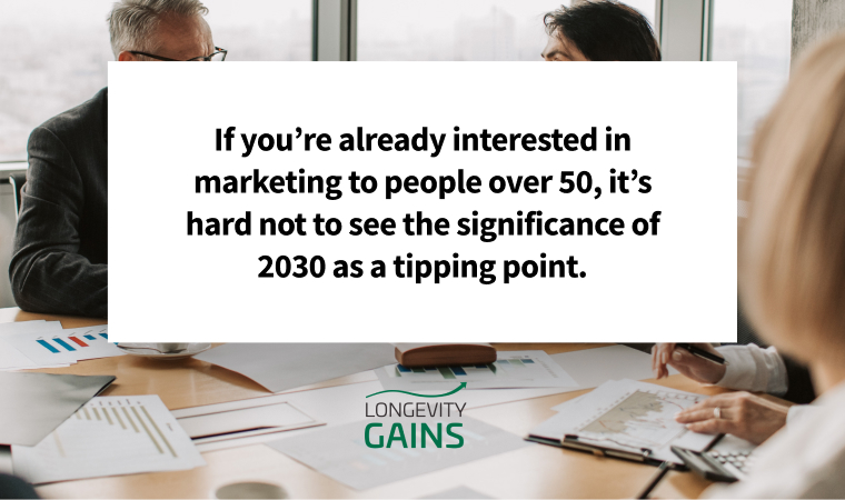 If you’re already interested in marketing to people over 50, it’s hard not to see the significance of 2030 as a tipping point. But while we’ve seen the demographic shift coming for decades, most people are still clueless that it’s happening or don’t even want to think about it.