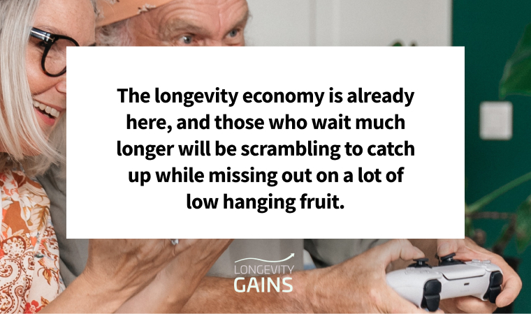 The interrelated point of the three news items above is clear: the longevity economy is already here, and those who wait much longer will be scrambling to catch up while missing out on a lot of low hanging fruit.